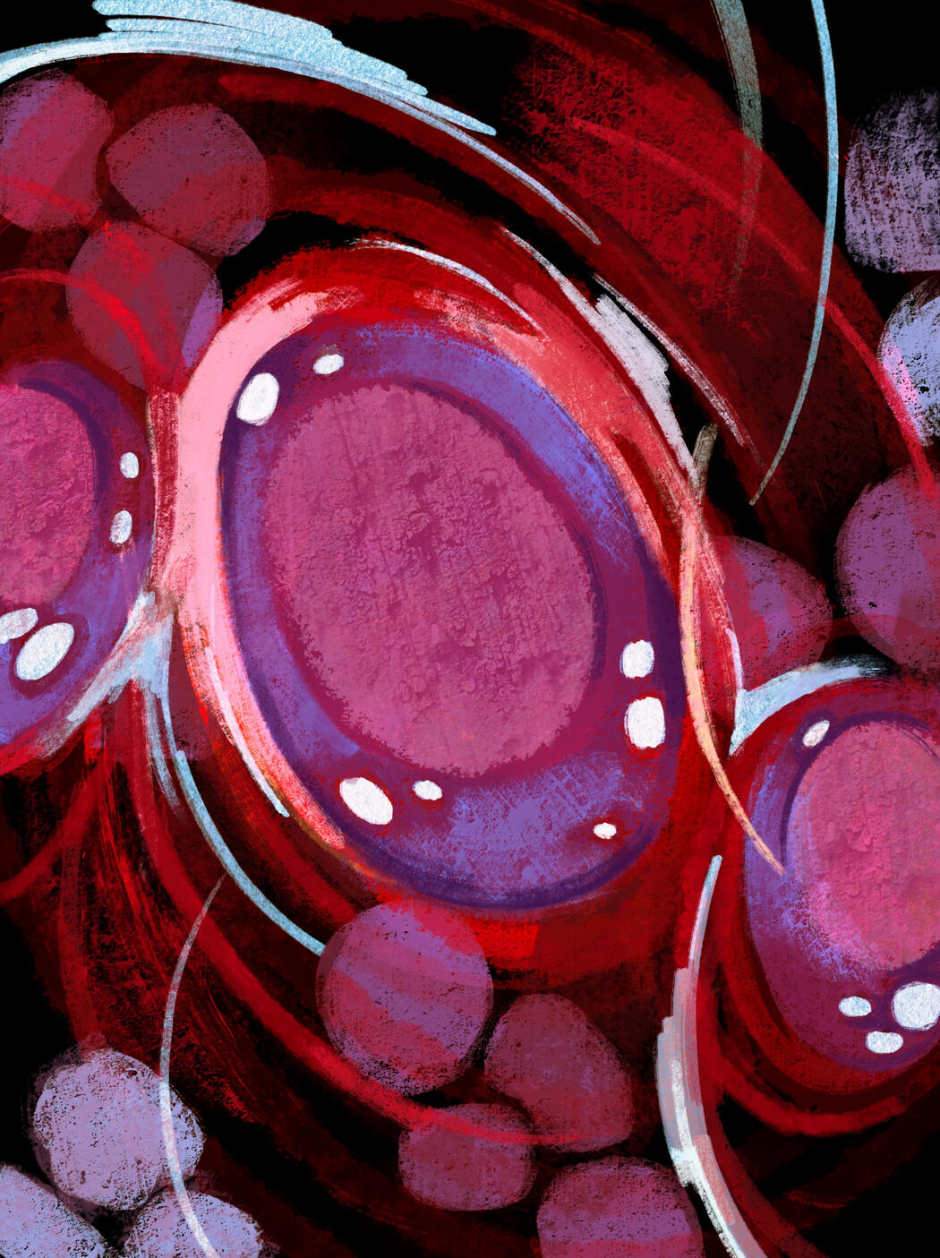Illustration of hematopoietic progenitor cells with vacuoles and inflammation, characteristic of VEXAS syndrome.